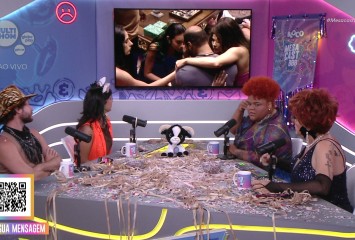 Após analisarem o Queridômetro, Isabelle, MC Bin Laden e Giovanna conversam na sala. A cunhã-por...