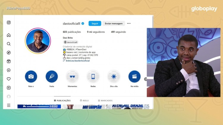No Bate-Papo BBB, ficou impressionado ao ver que já atingiu o marco de 9 milhões de seguidores no Instagram. Após Thaís Fersoza e Ed Gama mostrarem recados de alguns famosos, a apresentadora contou que ia ajudá-lo a entender como estavam as coisas nas redes sociais. Ao ver o número, o baiano ficou incrédulo e sem fala.