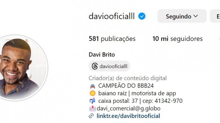 É campeão! Um dia após Davi vencer a grande Final do BBB 24 e se tornar o novo milionário, o baiano atingiu a marca de 10 milhões de seguidores no Instagram. O vencedor é o participante mais seguido da temporada. Na noite de terça (16), o ex-brother recebeu 60,52% da média dos votos e superou Isabelle e Matteus na final do reality.