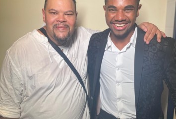 Babu Santana posa ao lado de Davi em camarim — Foto: Fernanda Almeida/gshow Encontro de gigantes...